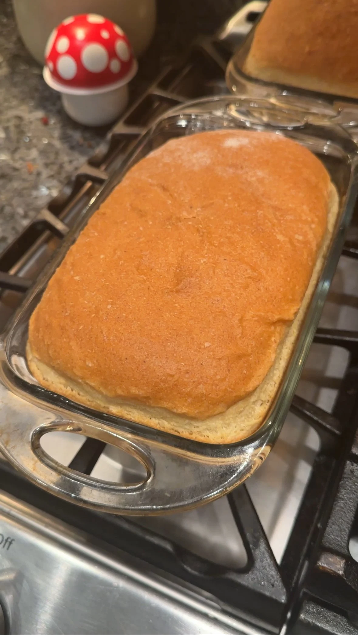 Place your loaves into greased loaf pans and allow to sit for an hour for their second rise. While they are in their second rise, preheat your oven to 350 degrees farenheit