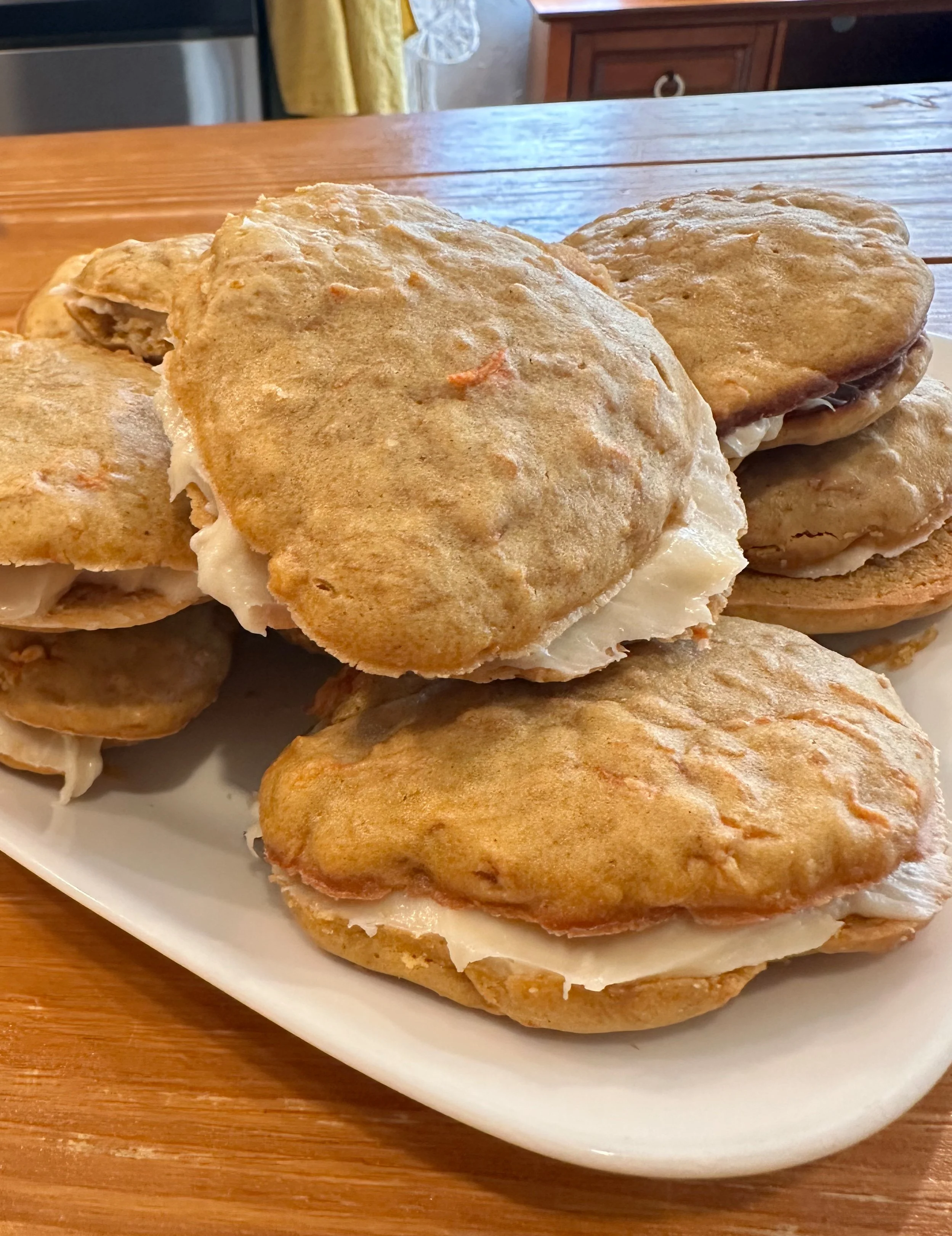 2. Add a dollop in between 2 of your sourdough carrot cake cookies and create a “sandwich” with them